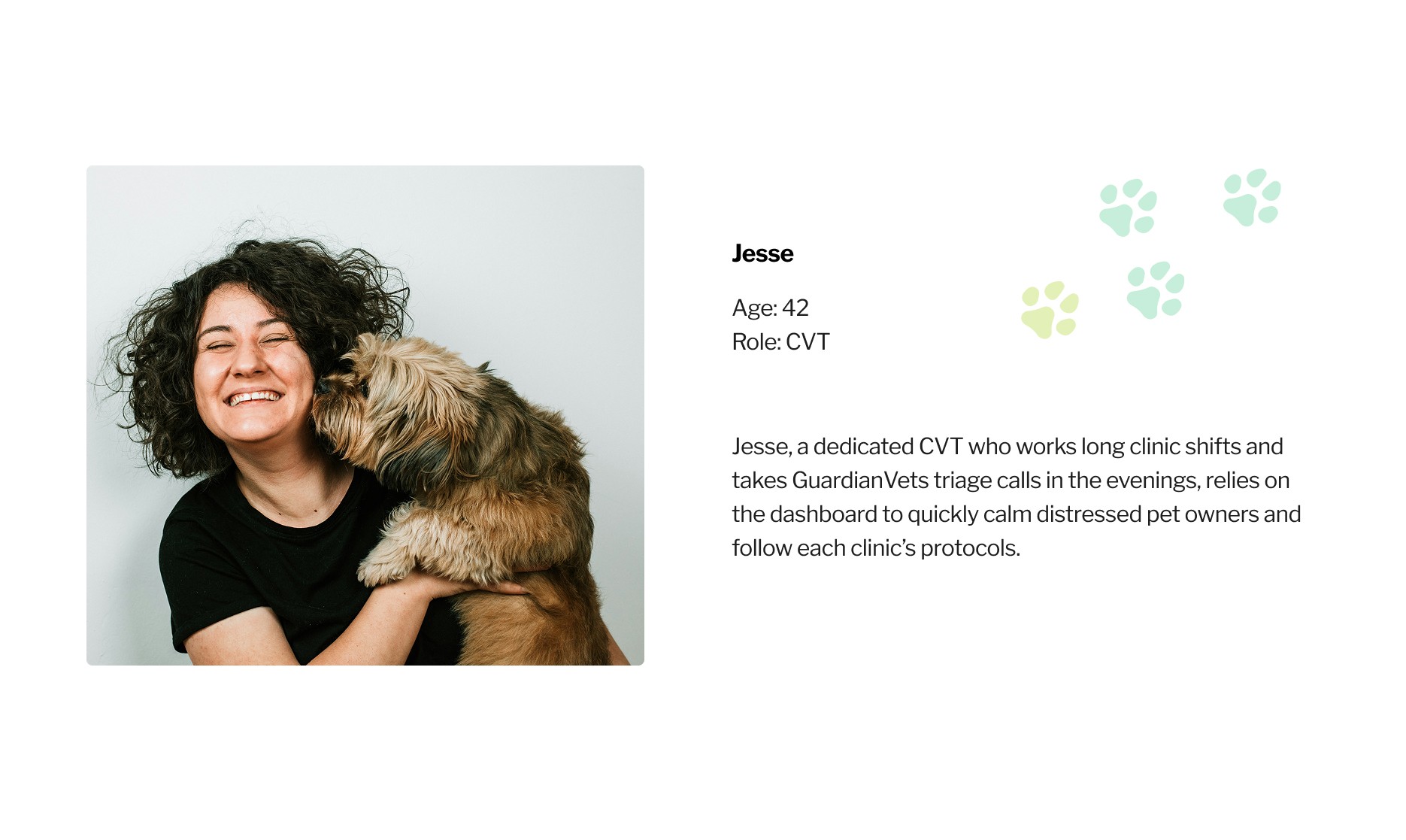 Highly trained and deeply empathetic, Jesse's a seasoned CVT who juggles daytime clinic work with evening triage shifts, often handling 8-10 calls an hour. But even with her experience, GuardianVet's current system works against her.