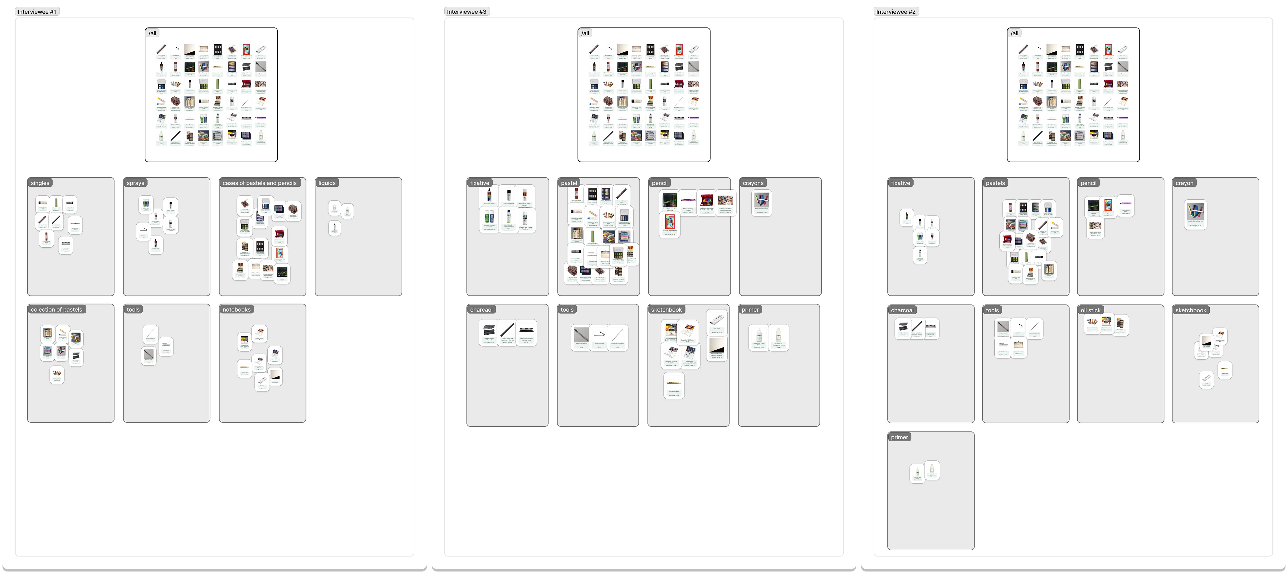 Listing current art materials at L. Cornelissen's website, I asked three interviewees to sort them into categories. As the website has many categories with only one product, the outcome of this finding was reduction of the number of categories and merging related product in ways in which the users expreinced them. Finally, card sorting led me to make the information architecture.