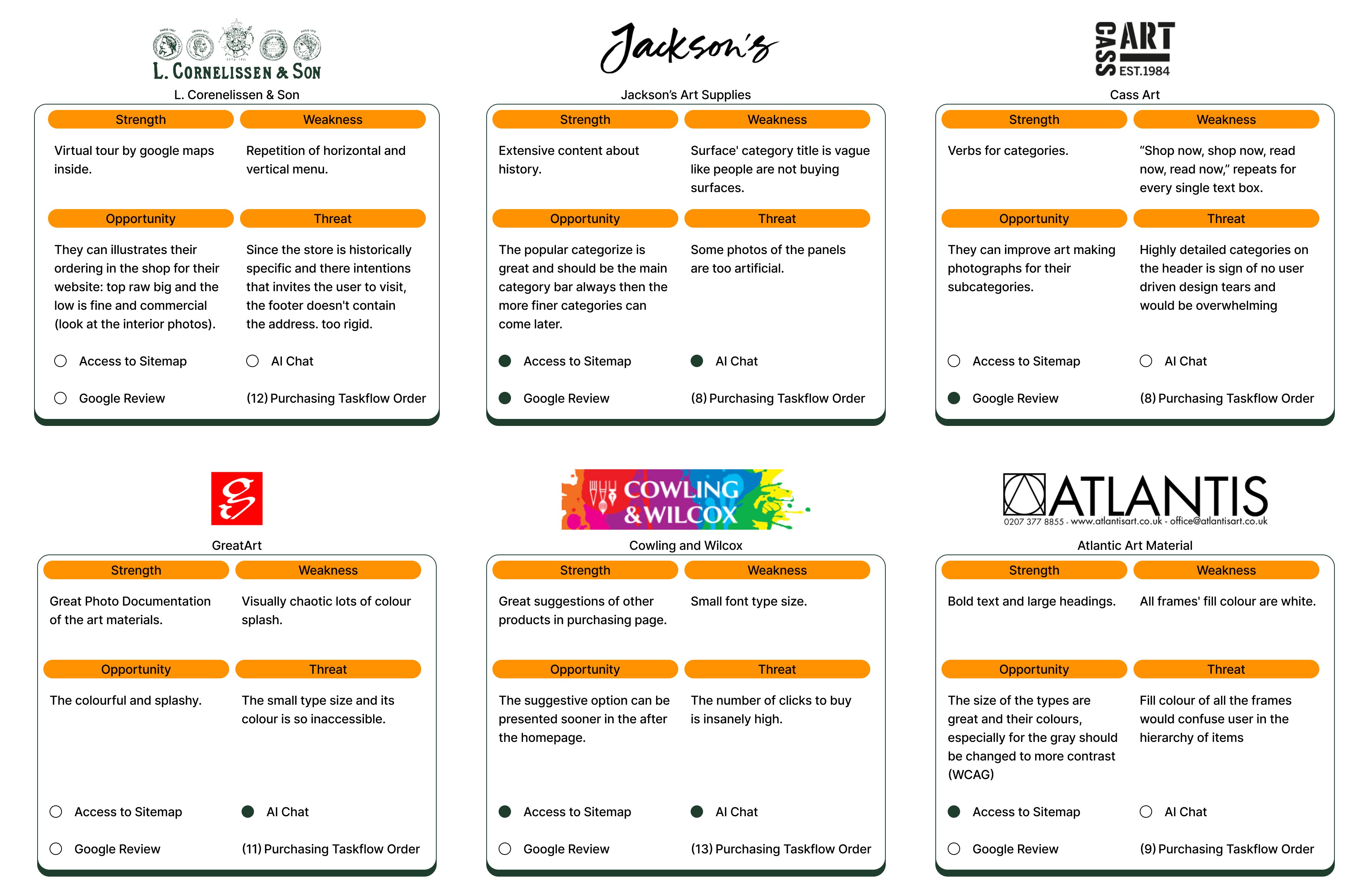 Having the personas and sketches in hand, I researched online art shops in London to check how accessible is their content and their Strenght, Weakness, Oppertunity, and Threats. I’ve analyzed several competitor websites to identify their key features. Here are the specific improvements that I planed to integrate: Strategic Design Enhancements Historical Context (Inspired by Jackson's): Incorporating educational content regarding the history of materials to add depth and authority to the site. Action-Oriented Navigation (Inspired by Cass Art): To improve the user journey, I’ll categorize products by verbs—such as Draw, Print, and Paint—rather than just traditional categories. Smart Bundling (Inspired by GreatArt): When a user selects an item, I will provide "group suggestions" for complementary products to enhance the shopping experience. Visual Fidelity (Inspired by Cowling and Wilcox): I aim to elevate the site’s aesthetic by utilizing high-quality, professional photography. Accessibility & Readability (Inspired by Atlantic): Most importantly, I am prioritizing high type-and-text contrast. This supports my design decision to ensure the site is fully accessible for my primary persona, who has dyslexia.