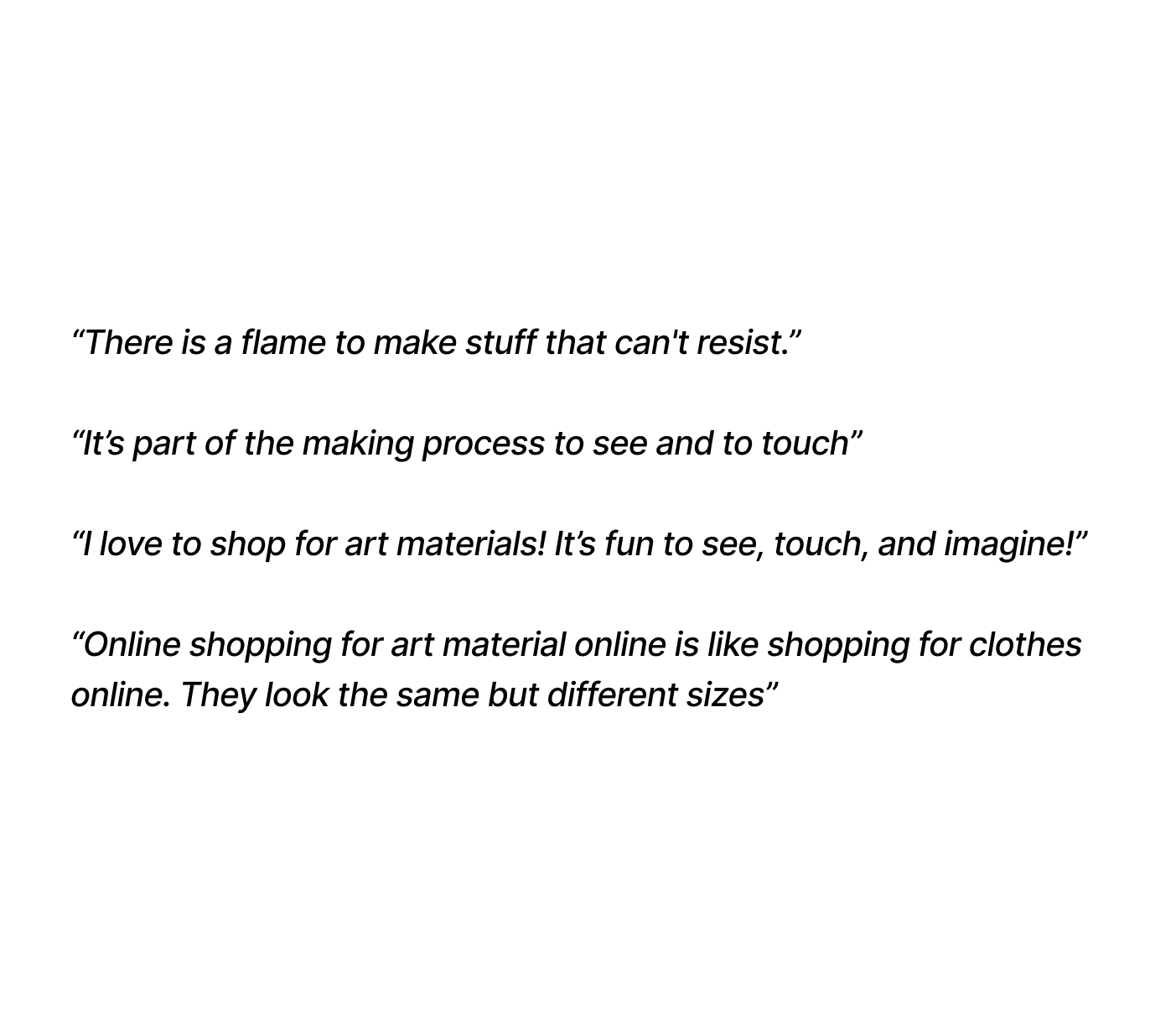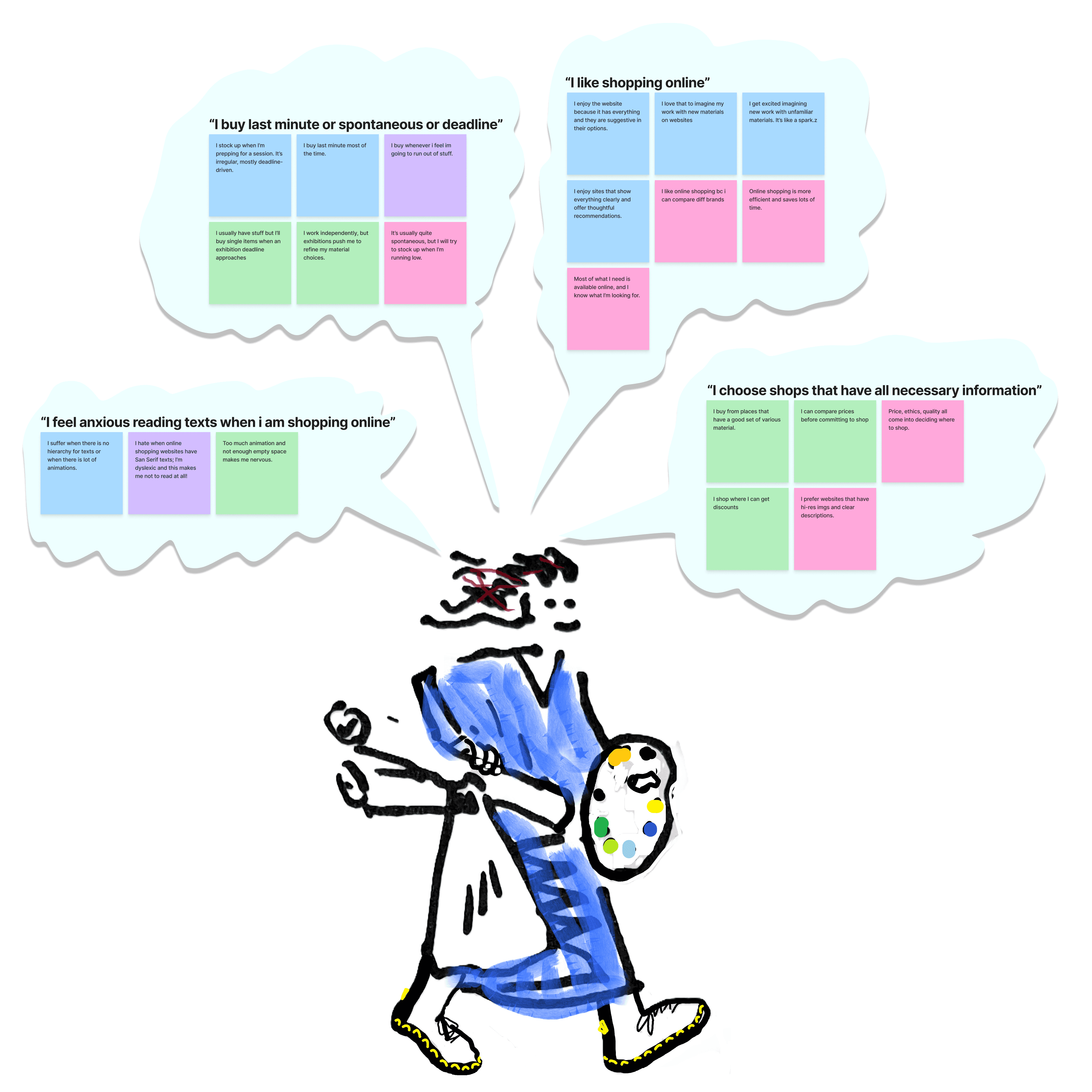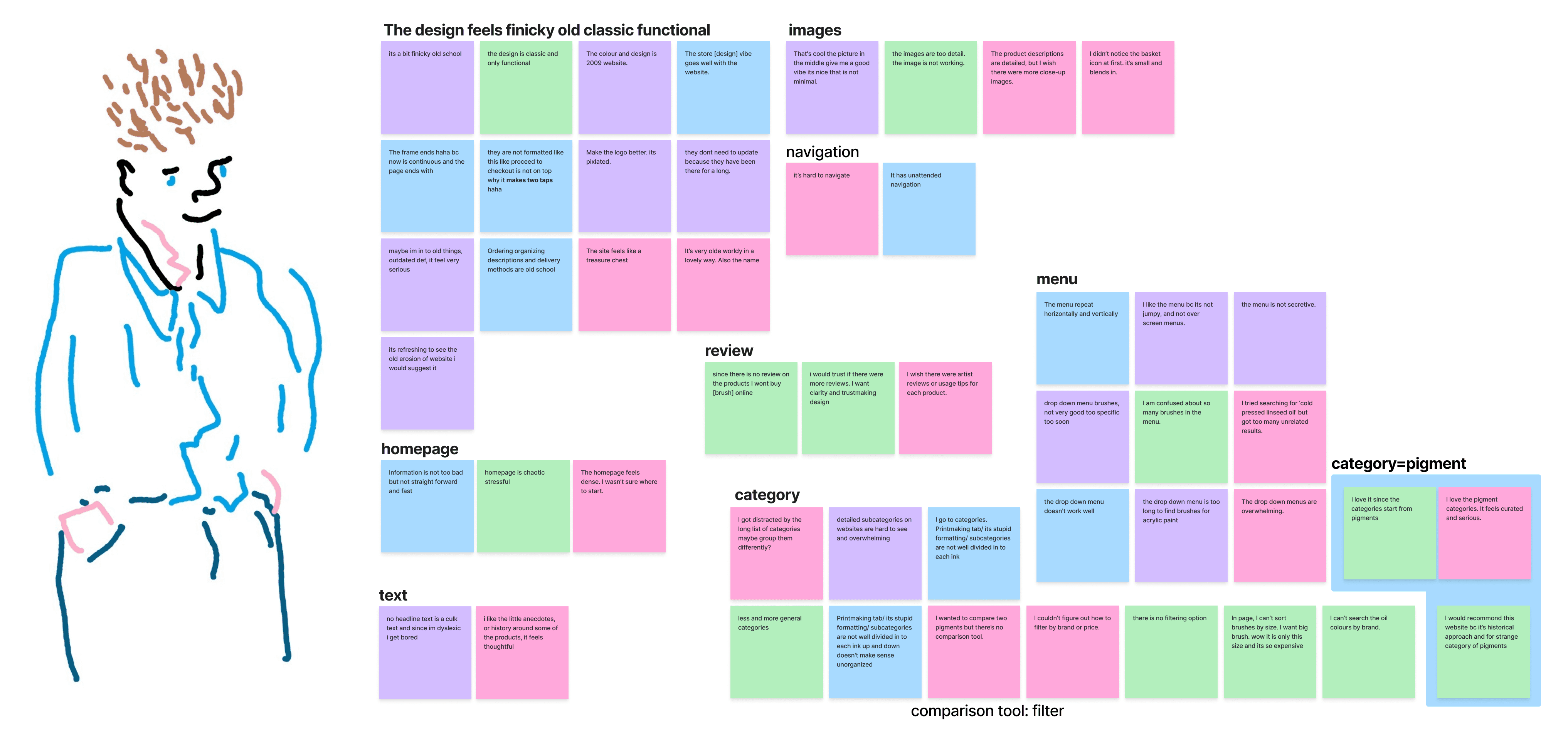With 4 interviews, I made an affinity map that has two section: 1. "I Statements," which the interviewees gave their answers about online shopping for art materials and 2. usability test of L. Cornelissen's website's elements and flows. Anna White Afshar came to live by ethnographic approach to the interviewees and Mark L. become an alternative navigator of the website as an AI assistance.
